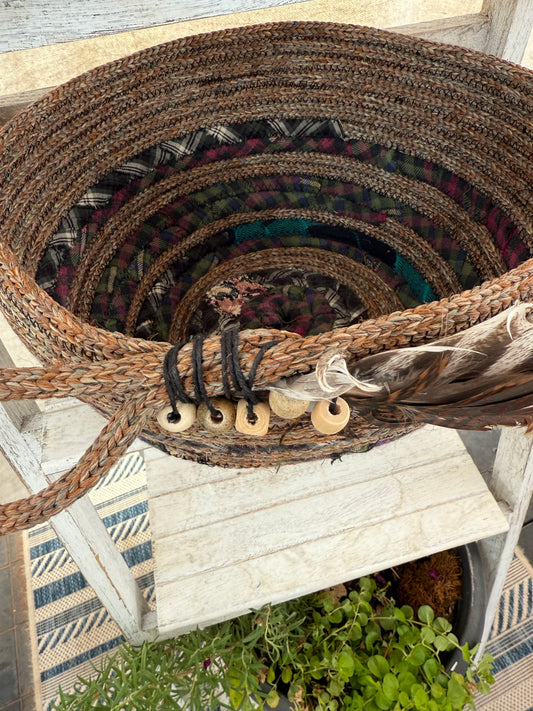 Sold outBuffalo feathers rope basket