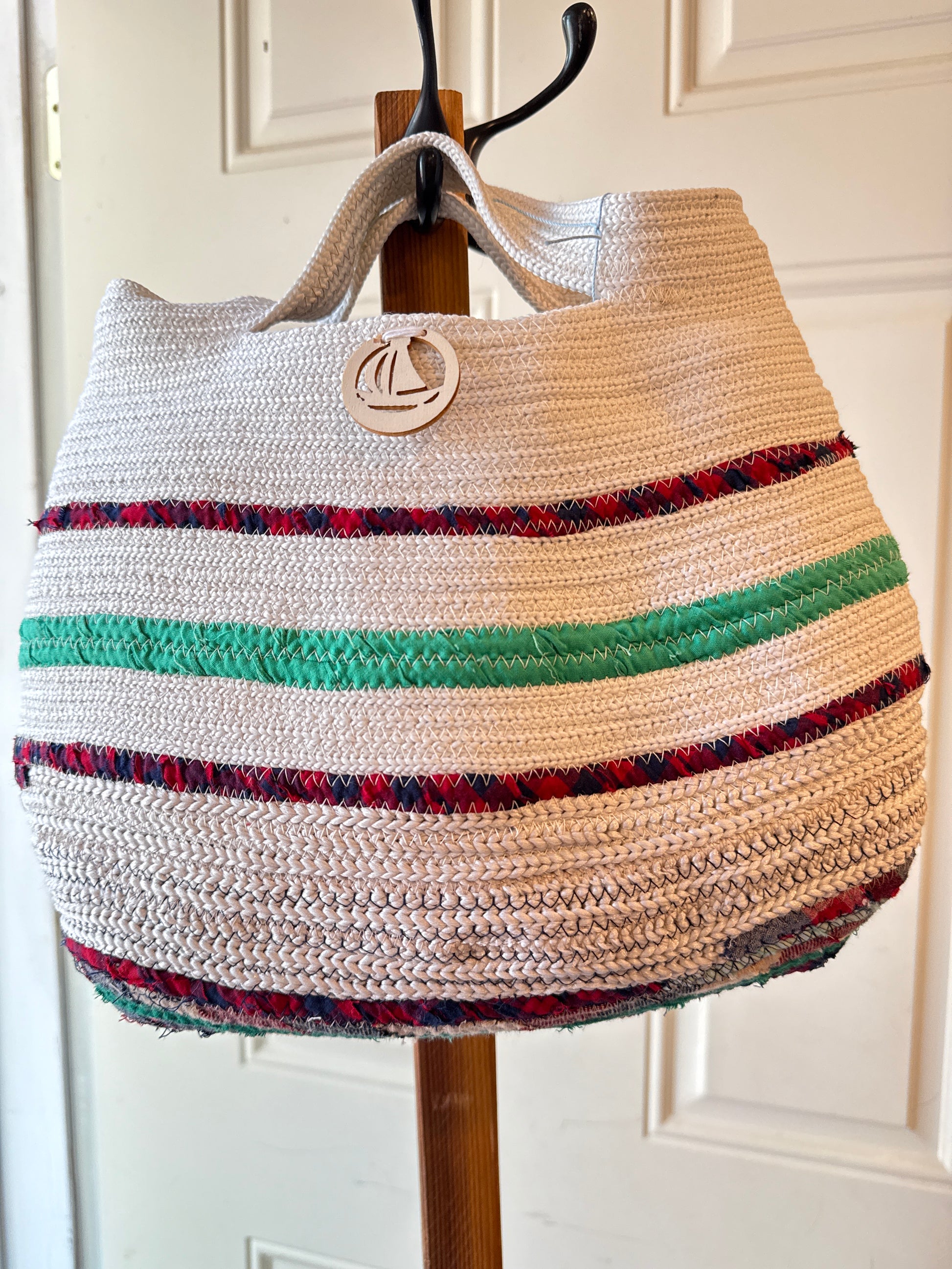 Perfect “project bag” or unique hanging basket. Use it out on errands or hang it in your home and fill it with, scarves, hair accessories, wash cloths in a guest bathroom, endless possibilities to show you style in your wardrobe or home