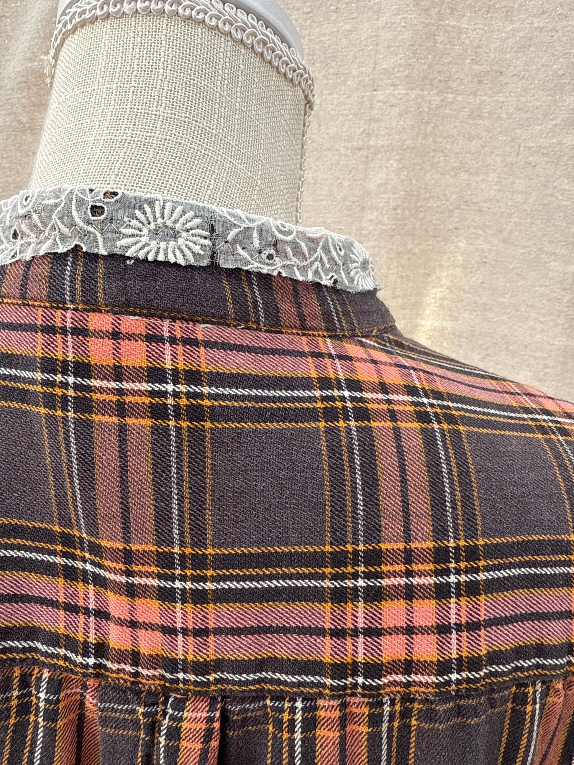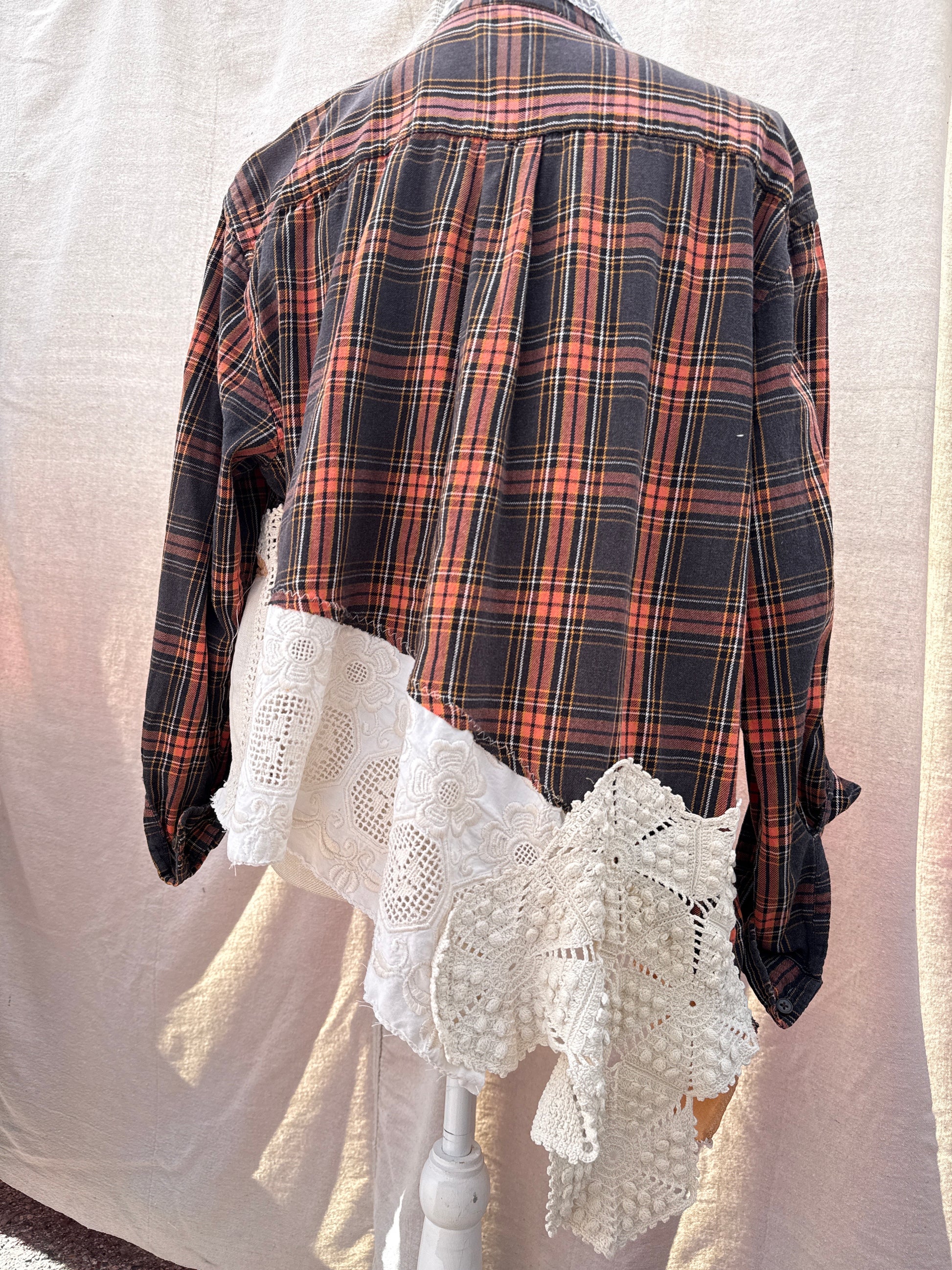 Level up your flannels with this be spoke creation! Perfectly worn in flannel with a complete vintage lace makeover! Asymmetrical hemline, perfect over leggings or jeans. How about layering it over a long T-shirt dress with boots! Artful expression of your unique style!